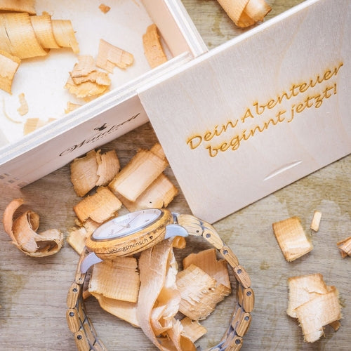 This Barrique masterpiece inherited its name from grapevines and is an 'accessoire' for men with exquisite taste. The strap is hand-crafted from oak wood that previously served as a wine barrel in France and Austria and now functions as an extraordinary piece of art. A unique detail about this piece is its cork-shaped crown that moves the silver watch hands. The extraordinary design and the history of the wooden watch make it an ideal gift for wine lovers.