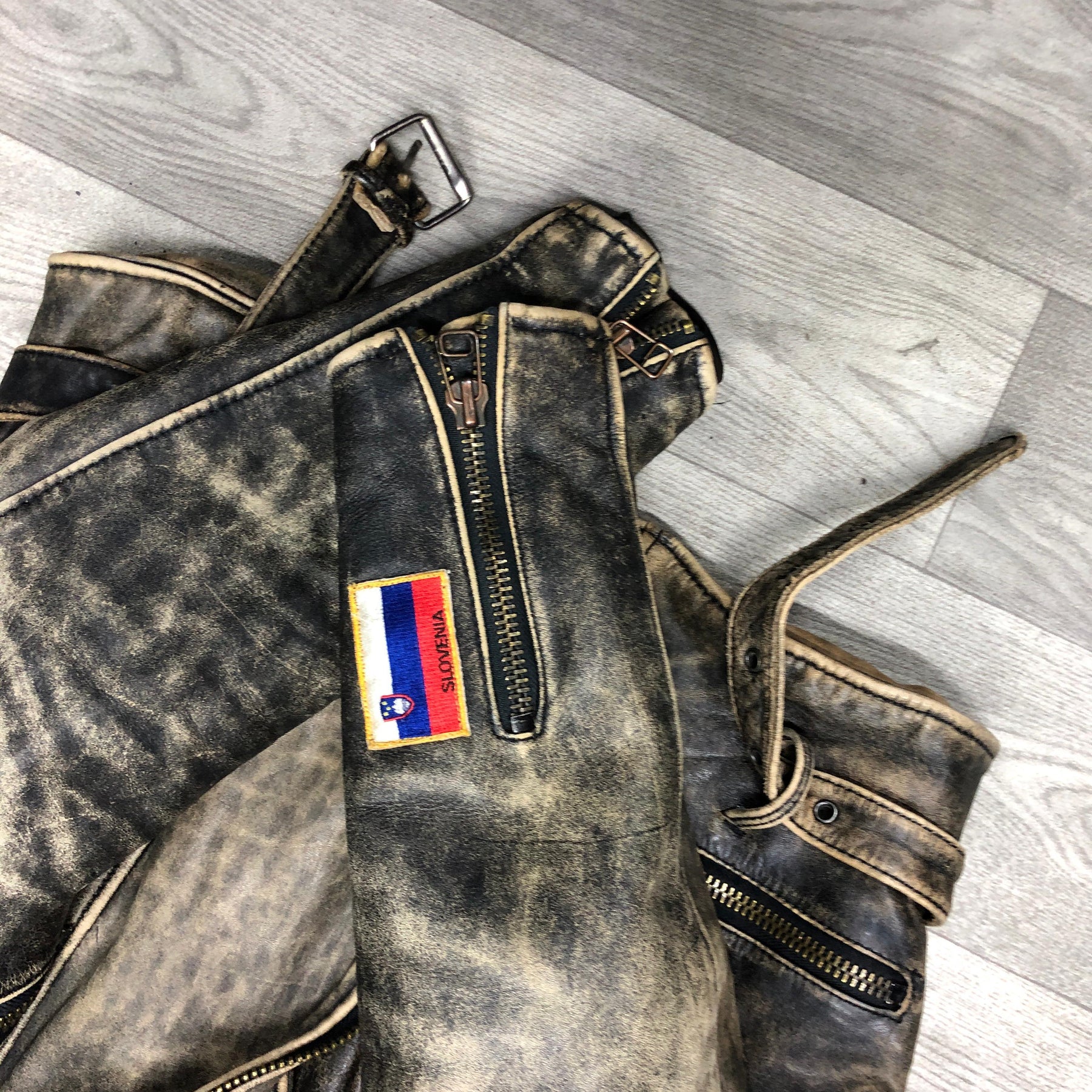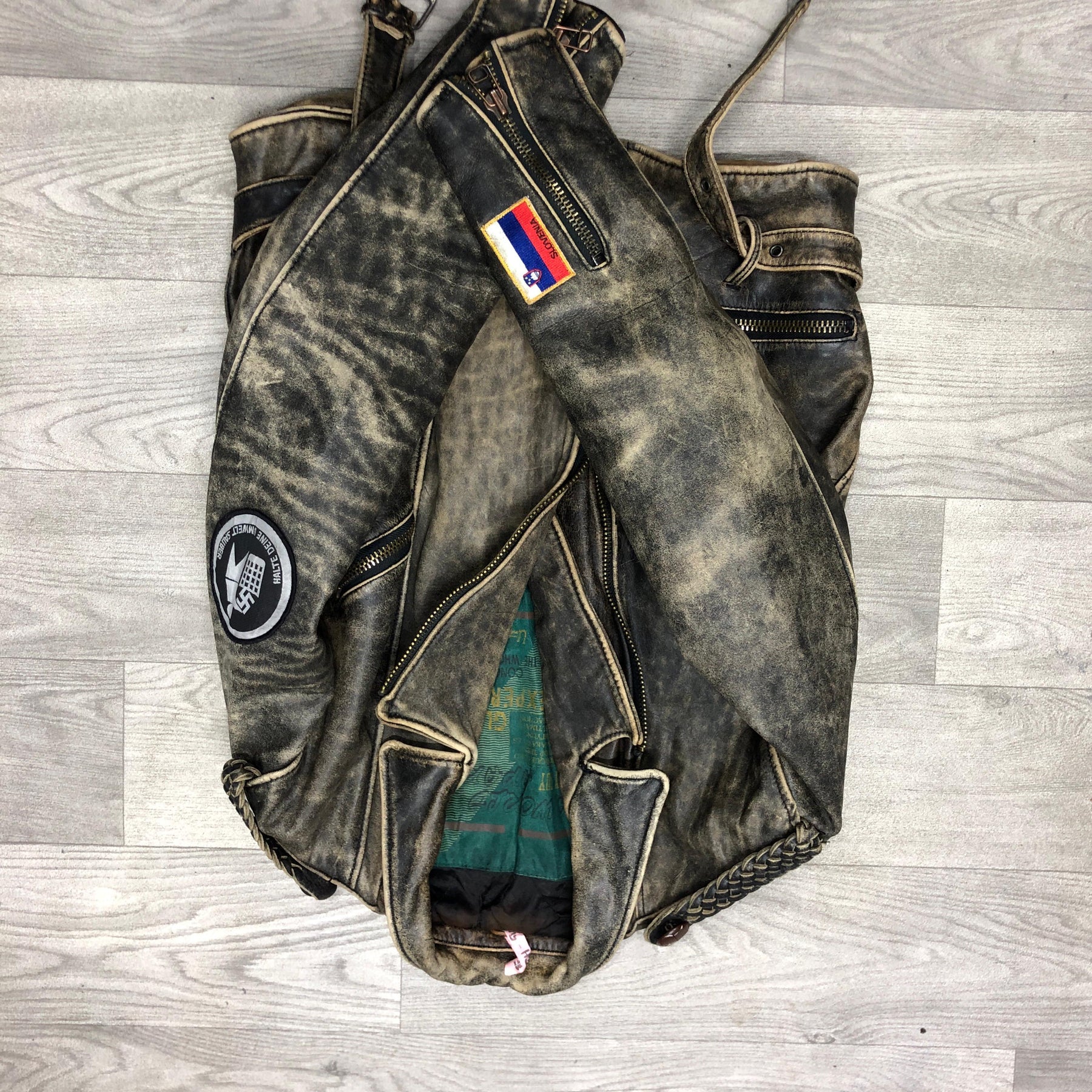 A rugged distressed leather biker jacket with a smoky vintage finish, braided shoulder details, bold sleeve patches, and an asymmetrical zip. It looks worn-in, tough, and built for someone who wants a raw, rebellious style.