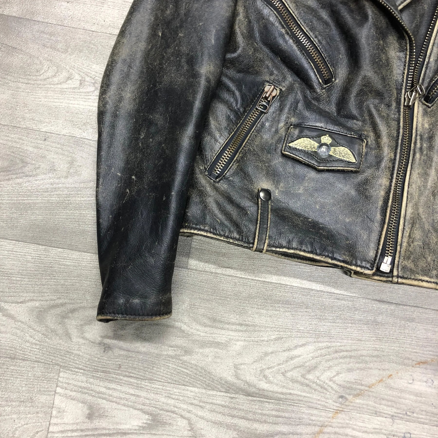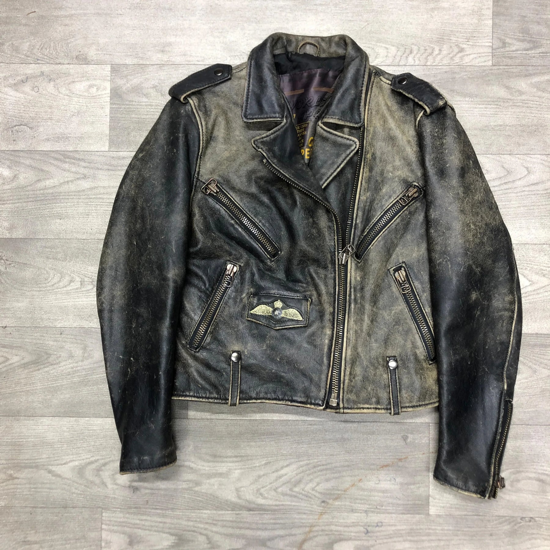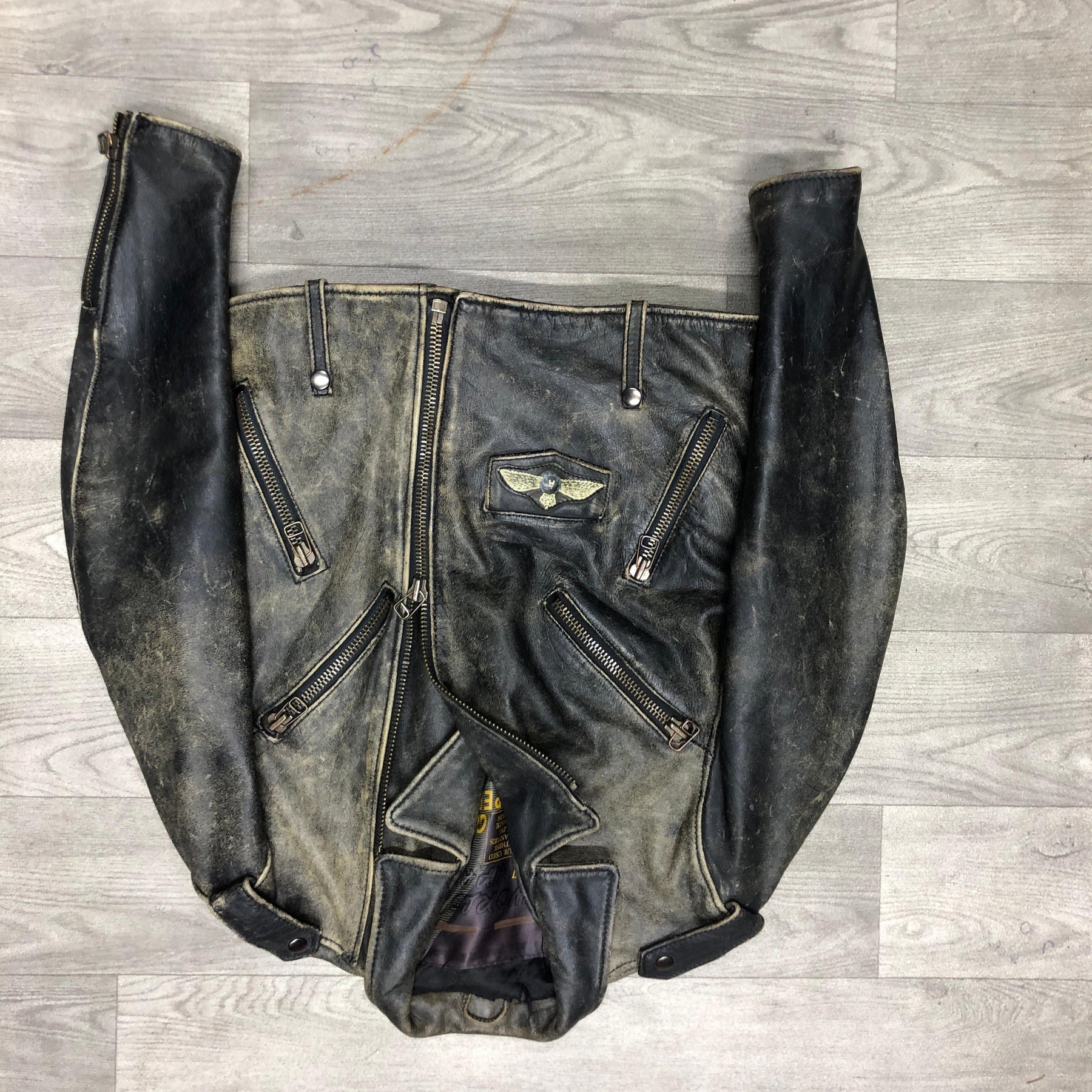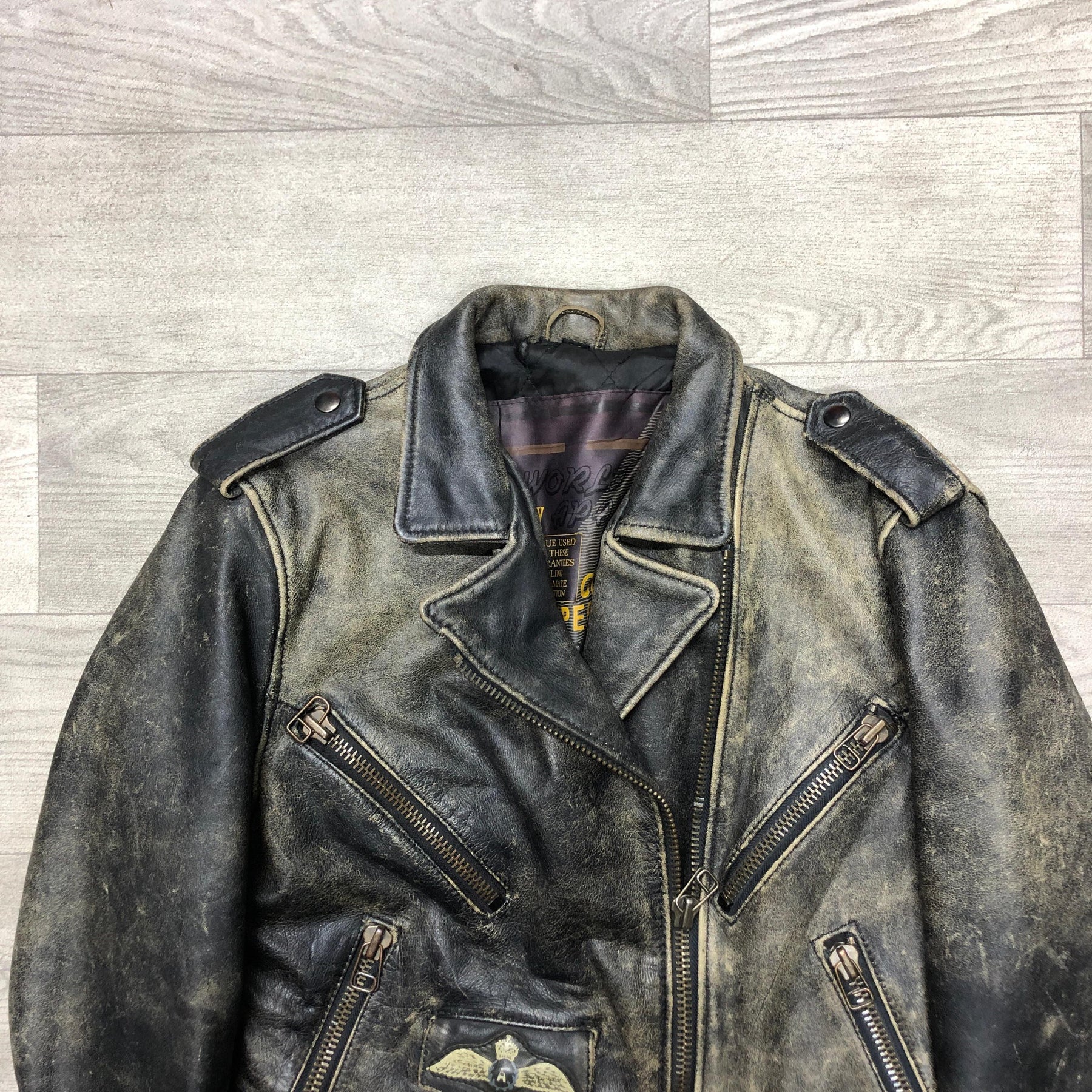This is a Vintage 80s Ugly Boy brown leather jacket, built with that thick, heavy, real-hide construction you don’t see anymore. It has a motorcycle/flight hybrid design — broad shoulders, wide collar, chunky zippers, and a slightly boxy silhouette. The leather shows that authentic 80s aging: worn creases, darkened edges, and a patina you only get from decades of use. It’s the kind of piece that looks like it’s lived through bar fights, night rides, and bad decisions — in a good way. Rare as hell, especially in this condition, and easily a centerpiece for vintage or biker fits.